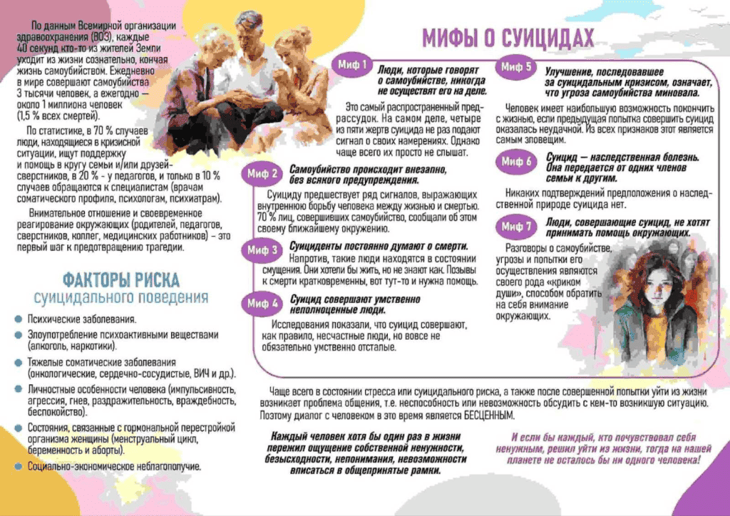 7. Не предлагайте неоправданных утешений. Одним из важных механизмов психологической защиты является рационализация. После того, что вы услышали от кого-то о суицидальной угрозе, у вас может возникнуть желание сказать: «Нет, вы так на самом деле не думаете». Для этих умозаключений зачастую нет никаких оснований за исключением вашей личной тревоги.
