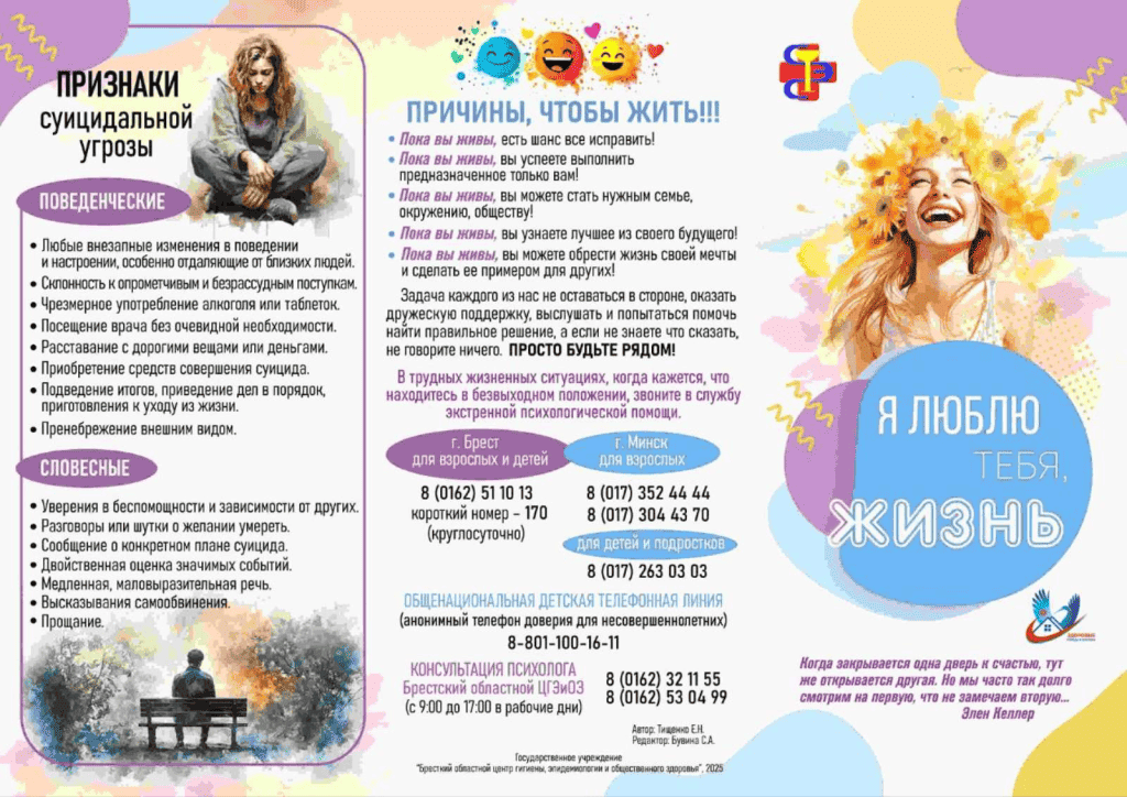 11. Не оставляйте человека одного в ситуации высокого суицидального риска. Оставайтесь с ним как можно дольше или попросите кого-нибудь побыть с ним, пока не разрешится кризис или не прибудет помощь. Возможно, придется позвонить на станцию скорой помощи или обратиться в поликлинику. Помните, что поддержка накладывает на вас определенную ответственность.