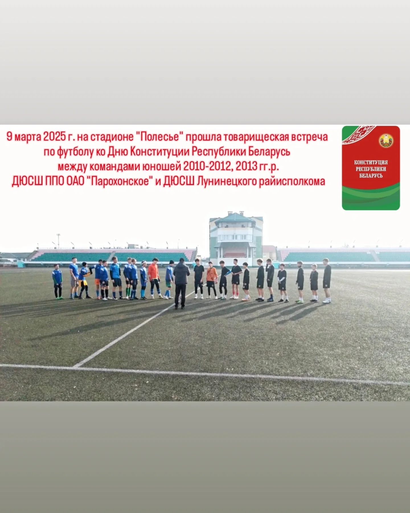 9 марта на на стадионе "Полесье" прошла товарищеская встреча по футболу ко Дню Конституции Республики Беларусь между командами юношей 2010-2012, 2013 г.р. ДЮСШ Парохонское и ДЮСШ Лунинецкого райисполкома.